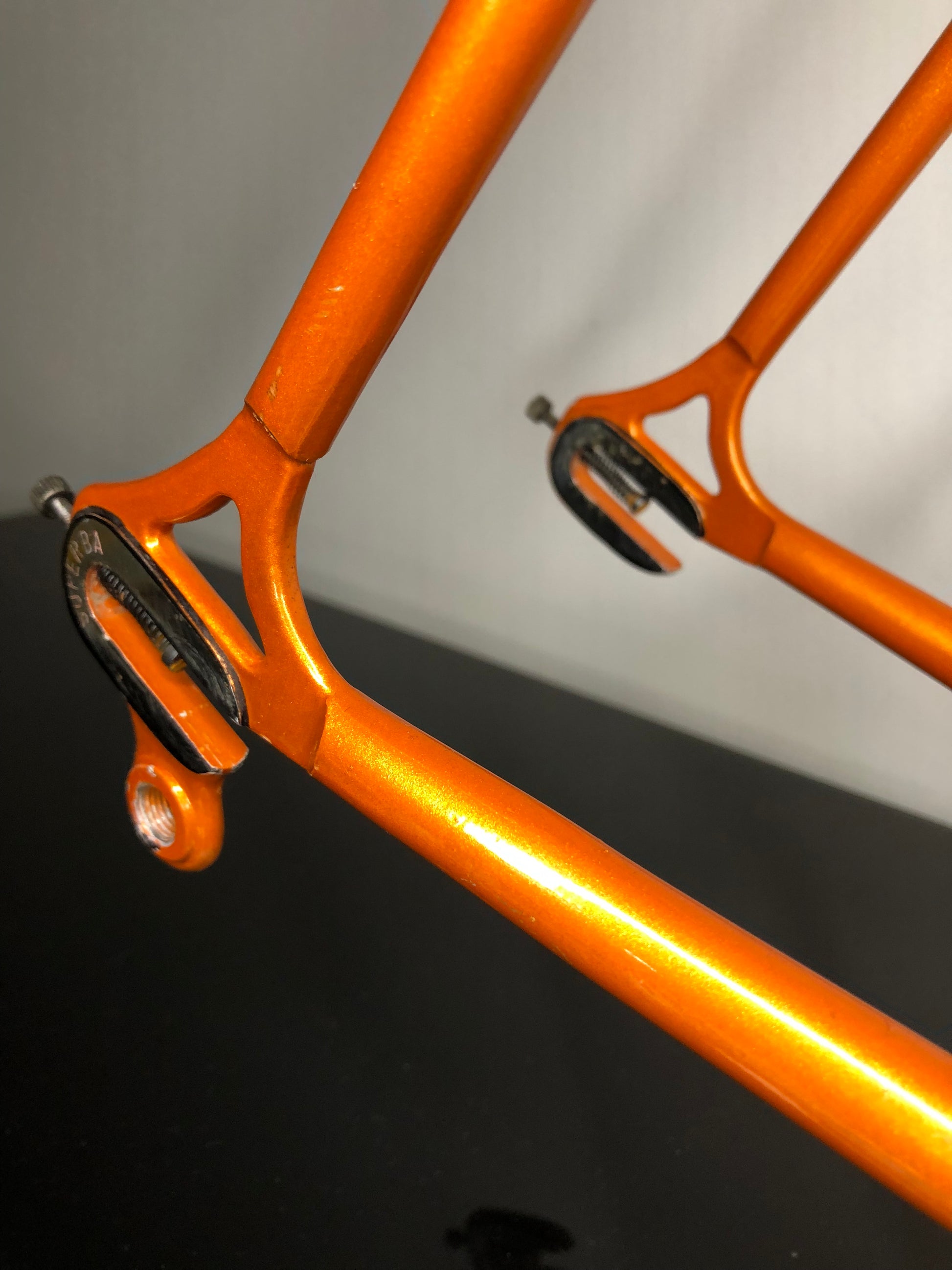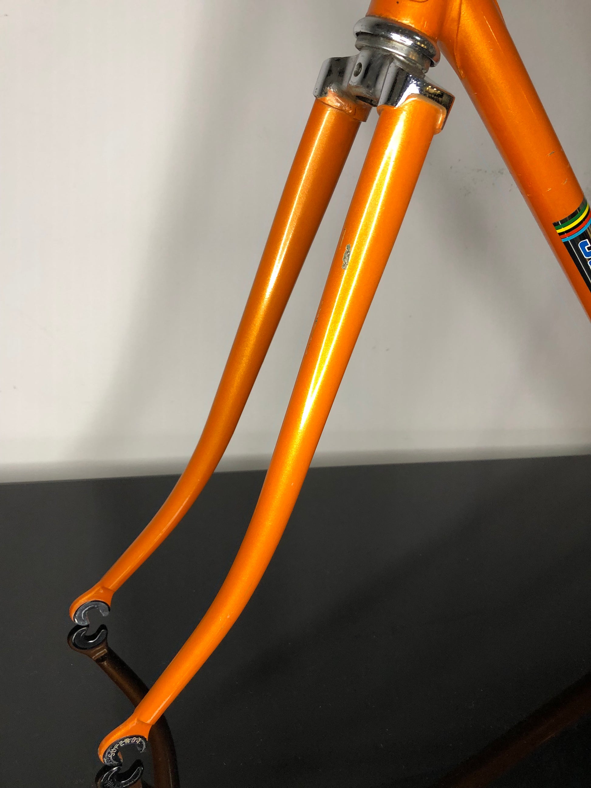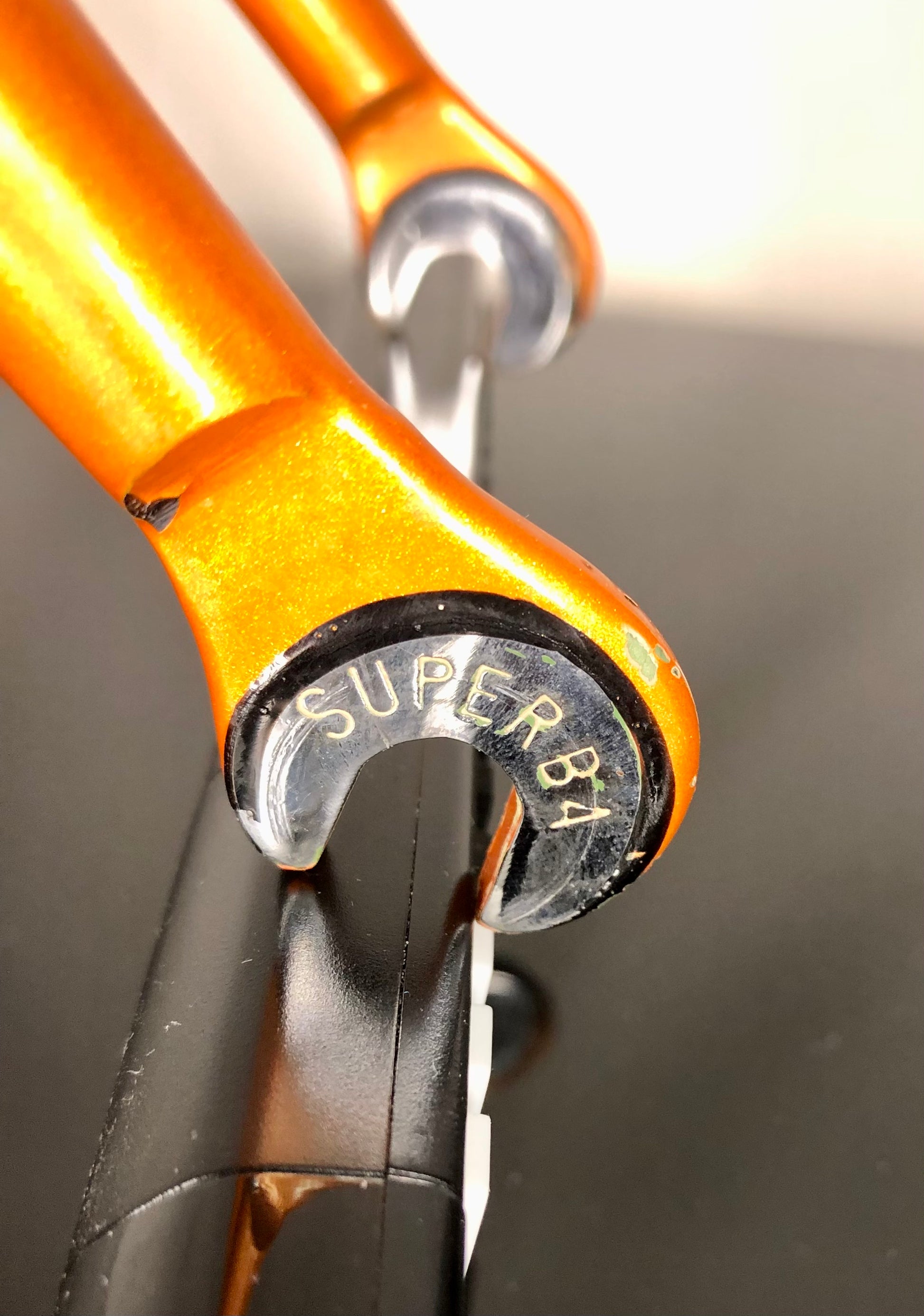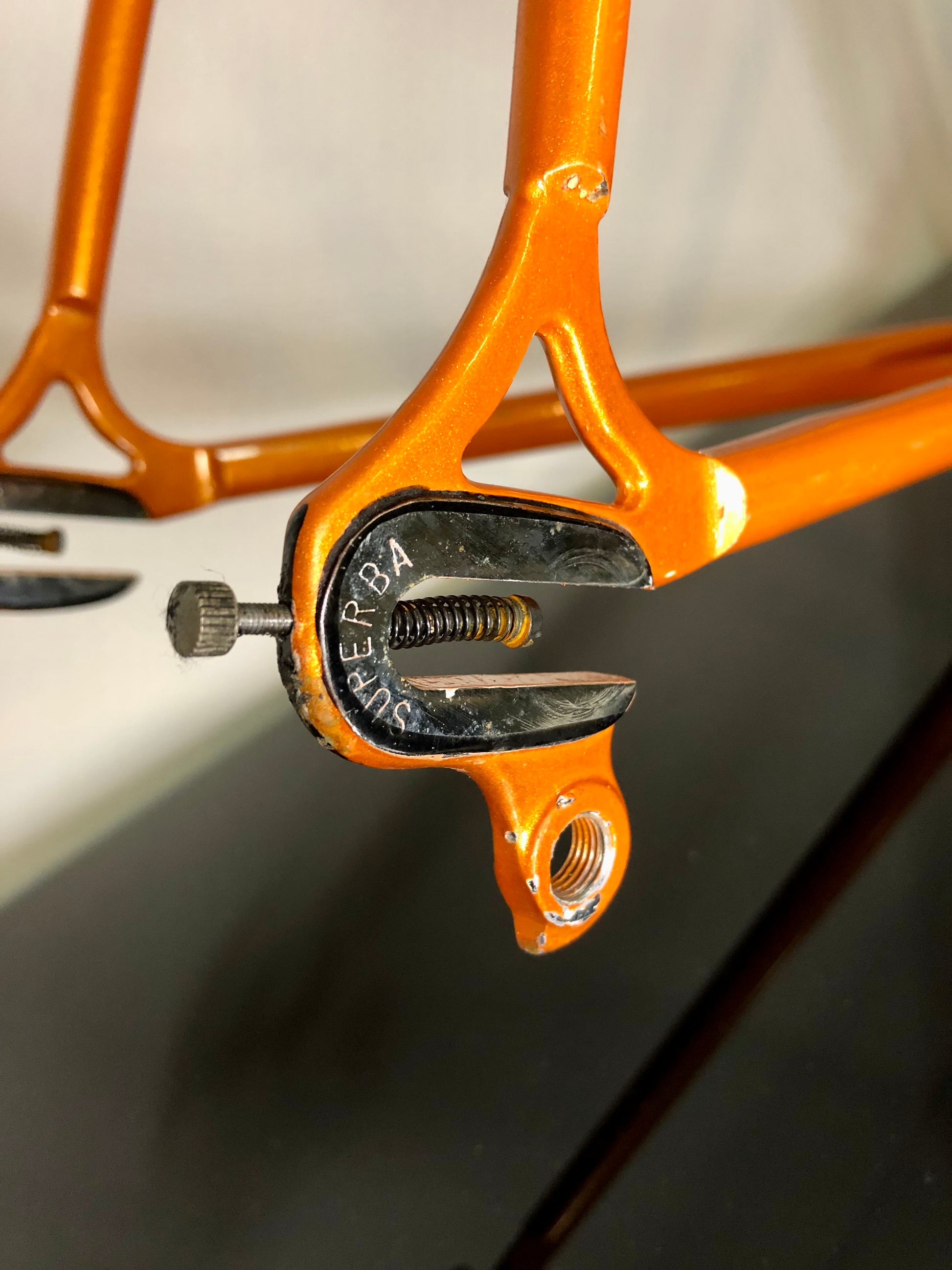La testa forcella e le estremità alte dei pendenti sono cromate, e i forcellini sono marchiati "Superba", con i posteriori dotati di vite di registro.